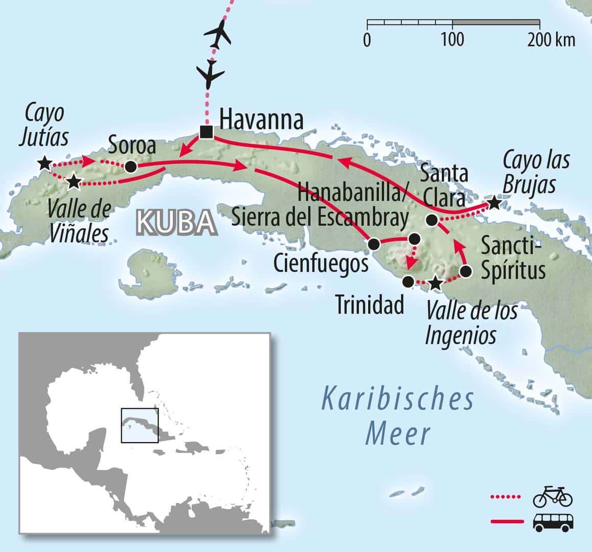 Die 16-tägige Tour „Cuba Cycling“ teilt sich –neben einem dreitägigem Aufenthalt in Havanna- im Wesentlichen in drei Programmschwerpunkte auf: Der erste Teil der Reise führt Sie in den Westen Cubas. Hier erwartet uns ein Mittelgebirge, die Sierra del Rosario, die als einzigartige Naturerscheinung unter dem Schutz der UNESCO steht, die Cordillera de Guaniguanico (maximale Höhe 699 m), und dem faszinierenden Valle de Viñales mit den bekannten Kalksteinhügeln den „Mogotes“, verschiedenen Höhlenkomplexen und den weltberühmten Tabakplantagen. Der zweite Teil der Reise führt Sie durch Zentralcuba. Die herrliche Mittelgebirgslandschaft der Sierra Escambray (höchste Erhebung 1140 m) und die südliche Karibikküste prägen die Tagesetappen. Der kubanischen Kultur, dem karibischen Lebensgefühl und der revolutionären Vergangenheit begegnen wir in Cienfuegos, Trinidad und Santa Clara. Den Abschluss bildet dann ein Badeaufenthalt in Jabacoa.