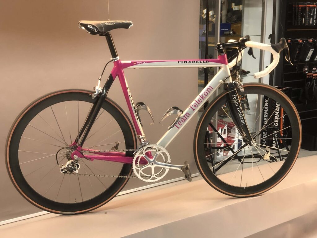 Das Teamrad von Andreas Klöden ist sicherlich eines seiner interessantesten Rennmaschinen. 2000 gewann Klöden auf diesem Rennrad Paris Nizza. Bei den Olympischen Spielen in Sydney war das Rad ebenso dabei. Ein Pinarello mit besonderer Schalt-Ausstattung von Campagnolo und Bora Laufrädern.