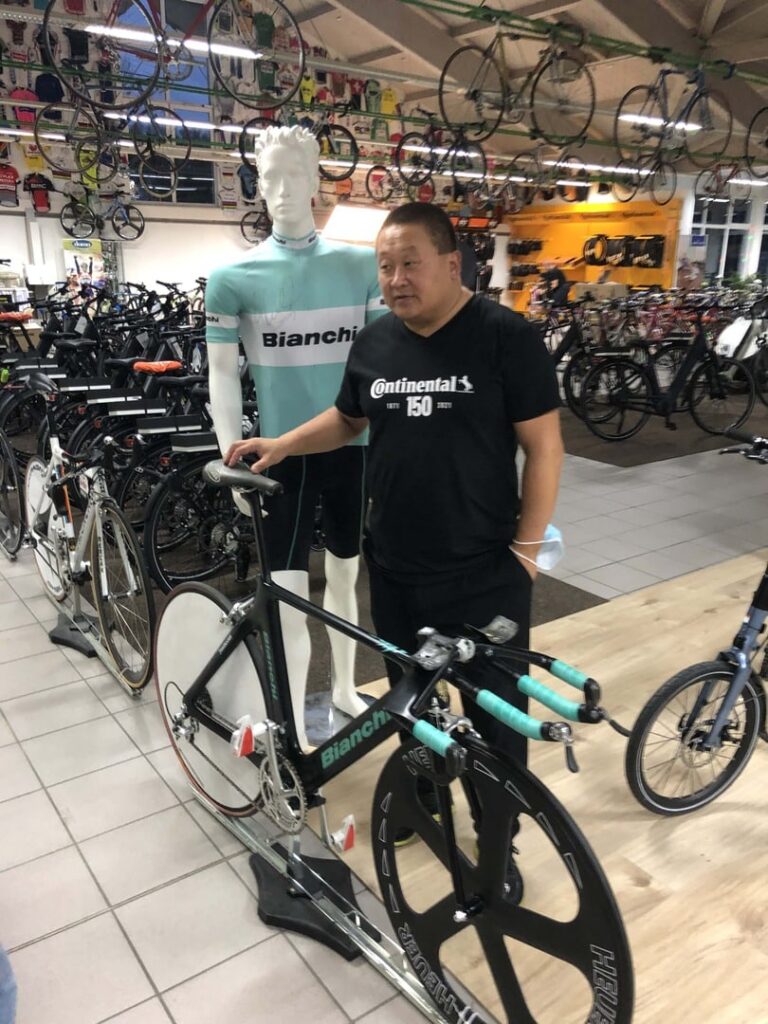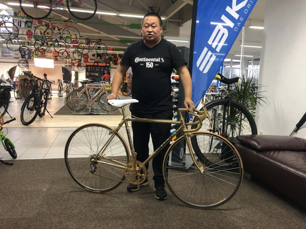Thai mit seinem Goldrad von Ernesto Colnago. Der Italienische Rahmenhersteller hatte Thai Do bereits einmal eingeladen, weil er erfuhr, dass Thai seinen Sohn den Vornamen Ernesto gab. Das hat den berühmten Radbauer aus Italien sehr imponiert. Die Goldräder von Colnago – es gibt insgesamt nur 100, stehen in den Wohnzimmern der berühmtesten Menschen dieser Welt. Unter anderem war Papst Johannes Paul Besitzer eines dieser berühmten Räder. Nun eines ist im ganz großen Wohnzimmer von Thai untergebracht, seinem Fahrradmuseum in Hüttlingen.