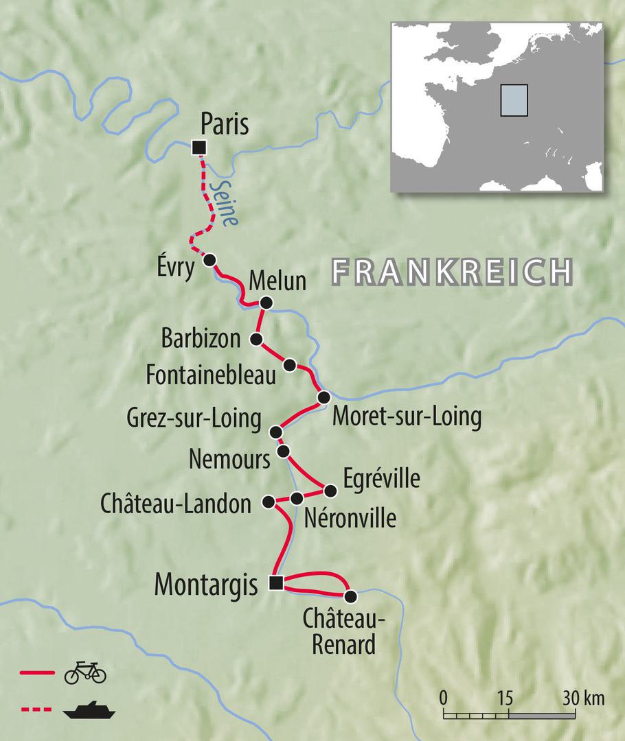 Diese Rad und Schiff Reise beginnt  in Paris, wo Sie das Schiff inmitten der Stadt, nicht weit der Notre Dame, finden werden. Wir folgen der Seine flussaufwärts, in südlicher Richtung. Diese Umgebung besitzt eine reiche, königliche Vergangenheit, die sich u.a. in das glanzvolle Schloss von Fontainebleau widerspiegelt. Genauso beeindruckend sind auch die Gärten, die die französischen Könige von ihren Hofarchitekten anlegen ließen. Diese Gegend war bei den Königen sehr beliebt, da sie in den umliegenden Wäldern hervorragend zur Jagd einladen konnten. Wir durchkreuzen die Wälder von Fontainebleau hin zum Künstlerdorf Barbizon, wo in der ersten Hälfte des 19. Jahrhundert viele Maler der später gegründeten „Barbizonschule“ lebten. Wir folgen der Seine bis Moret-sur-Loing, einer zauberhaften mittelalterlichen kleinen Stadt mit strategischer Lage am Ufer des Flusses Loing, wo der Maler Sisley Inspiration für zahlreiche seiner impressionistischen Gemälde fand. Von dort aus geht es weiter über den „Canal du Centre“ zu den schönen mittelalterlichen Städten Ferrières und Chateau-Landon mit der Abtei St.-Severin. Ziel der Reise ist Montargis, mit seinen mit vielen Blumen geschmückten kleinen Kanälen, die dem romantischen Städtchen einen ganz eigenen Charme verleihen. Die Radtouren verlaufen überwiegend über ruhige Landstraßen, abseits vom Alltagstrubel.