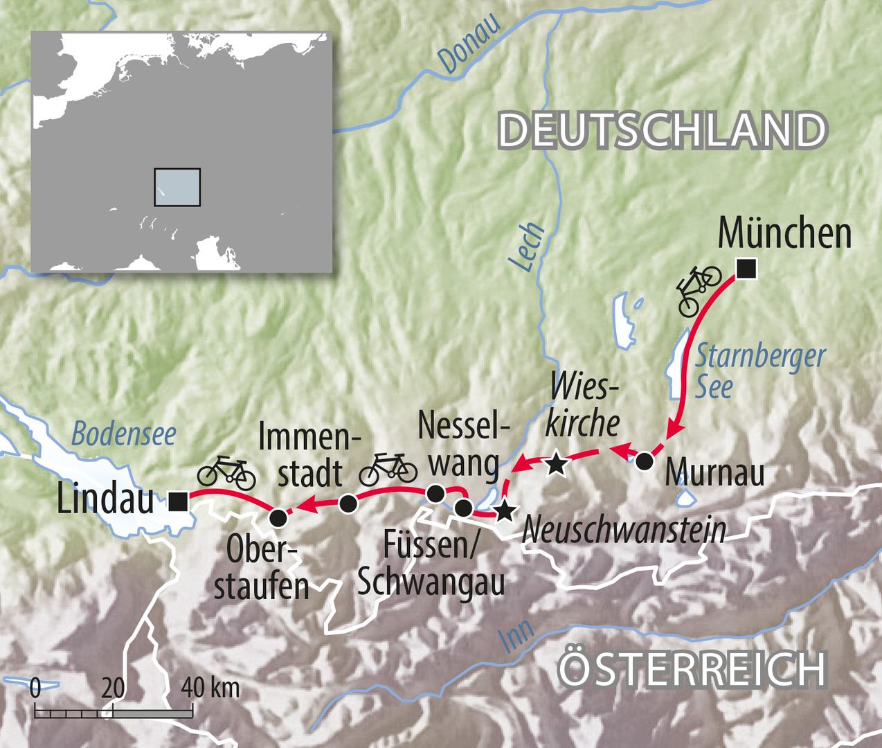 Die 7-tägige Radtour im Süden Deutschlands bietet ein perfektes Duett zwischen Natur und Kultur. Alpen, Seen, blühende Felder und urige Wälder versüßen Ihnen das „Radwandern“ von München über Füssen, Schwangau, Nesselwang, Oberstaufen bis Lindau. Im größten Moorgebiet Mitteleuropas, dem Murnauer Moos, eröffnet sich ein Flecken Erde mit unberührter Natur und saftigen Wiesen und Wäldern, so weit das Auge reicht. Gleichzeitig erleben Sie auf der Radtour den Inbegriff des „Romantischen Eklektizismus“, wie zum Beispiel die Wieskirche in Steingaden oder die Königsschlösser in Neuschwanstein.