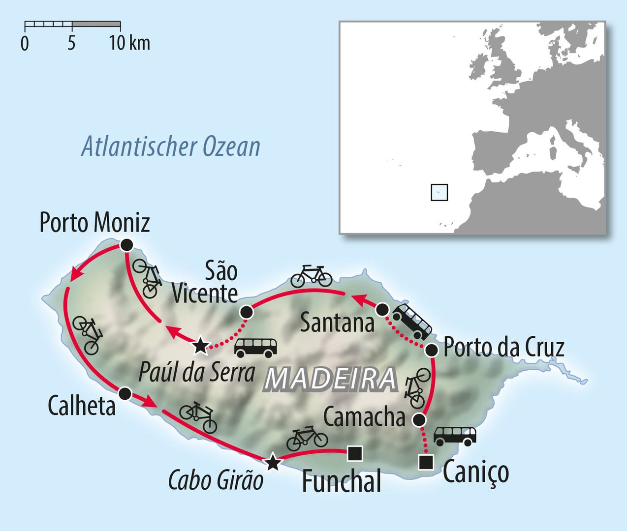 Sattgrüne Wiesen soweit das Auge reicht, dahinter der tiefblaue Atlantik: Willkommen auf der Blumeninsel Madeira! Die Radwoche auf der Atlantikinsel ist ein Erlebnis für erfahrene Radfahrer. An sieben Tagen radeln Sie fast einmal ganz um Madeira herum und lernen die Insel sowohl an der Küste als auch im Landesinneren kennen. Madeira ist übrigens zu fast jeder Jahreszeit ein Ziel für Radurlauber: Von Februar bis Dezember herrschen milde Temperaturen, so dass Sie auch im Winter eine kleine Auszeit mit dem Fahrrad nehmen können!