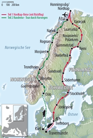 Wir beginnen die Fahrt mit dem Fahrrad zum Nordkap mit der Fährenüberfahrt von Lübeck-Travemünde nach Trelleborg/Malmö. Die erste Radstrecke führt uns zusammen durch die schwedische Landschaft Småland bis zum Ziel Växjö. Auf dem ersten Teil besuchen wir unter anderem das malerische Schloss Gripsholm, das allseits aus dem gleichnamigen Roman von Kurt Tucholsky bekannt ist. Angekommen in der schwedischen Hauptstadt, bleibt natürlich ausreichend Zeit für einen Bummel durch das wunderschöne Stockholm. Entlang des schwedischen Ostseeküstenradwegs fahren wir mit dem Fahrrad zum Nordkap bis zur Höga Kusten, die Hohe Küste, die als Abschnitt des Bottnischen Meerbusens zum UNESCO-Weltnaturerbe gehört. Nachdem wir die historische Grenzstadt Happaranda erreicht haben, verabschieden wir uns von Schweden und brechen mit dem Fahrrad bis zum Nordkap nach Finnland und menschenleeren Weiten des Lapplands auf. Im Anschluss erwartet uns bereits die Grenze nach Norwegen, wo wir dem Porsangerfjord als längsten Fjord Nordnorwegens folgen, der uns bis vor die Nordkapinsel führt. Auf dem Weg passieren wir neben zahlreichen Fjorden auch imposante Gebirge wie die berühmten Lyngen-Alpen und radeln mit dem Fahrrad zum Nordkap durch die fantastische Bergwelt der Ofoten-Berge bis zum Polarkreis. Von dort geht es ins Dovrefjell, wo noch wilde Moschusochsen leben bis auf die weitläufigen Hochebenen hinauf, bis wir Oslo erreichen. Nehmen Sie sich hier ausreichend Zeit für einen Stadtbummel. Im Anschluss wartet das absolute Highlight mit dem Besuch des Vigelandparks auf Sie, der über 200 Skulpturen aus Bronze und Granit zum Bestaunen bereithält, bevor es zum Fähranleger geht und wir zurück nach Hause schippern.