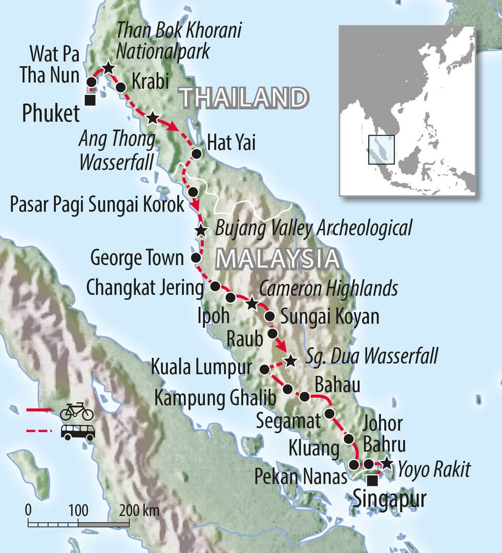 Diese Radtour umfasst Thailand, Malaysia und Singapur. Die Radreise beginnt in der berühmten Strandstadt Phuket, um durch den Süden Thailands weiter über die Grenze bis nach Malaysia zu Radeln. Wir empfehlen 1 oder 2 Tage vor Beginn der Tour in Phuket anzureisen, um Phuket und seinen wunderschönen Strand auf eigene Faust zu genießen. Entdecken Sie auf dieser Radtour folgende Orte: Phuket, Krabi und die Top 5 Orte in Malaysia: Penang (George Town), Cameron Highlands (pittoreske Landschaft der Teeplantage), Batu Cave, belebte Kuala Lumpur City, Malacca (The World Heritage Site zusammen mit George Town of Penang). Diese traumhafte Radreise endet in Singapur, dem Finanzdrehkreuz Südostasiens.