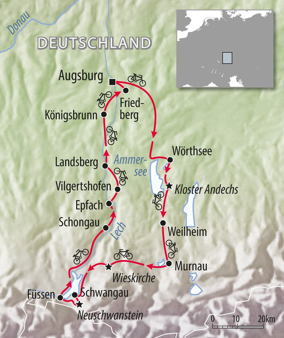 Direkt entlang des Wörthsees und Pilsensees zunächst zum Kloster Andechs. Durch den Pfaffenwinkel vorbei an urtümlich bayerischen Orten – ihnen gaben die Mönche der umliegenden 12 Klöster das heutige Aussehen. Bademöglichkeiten bieten außer dem Ammersee auch noch der Staffelsee und der Riegsee in Murnau.