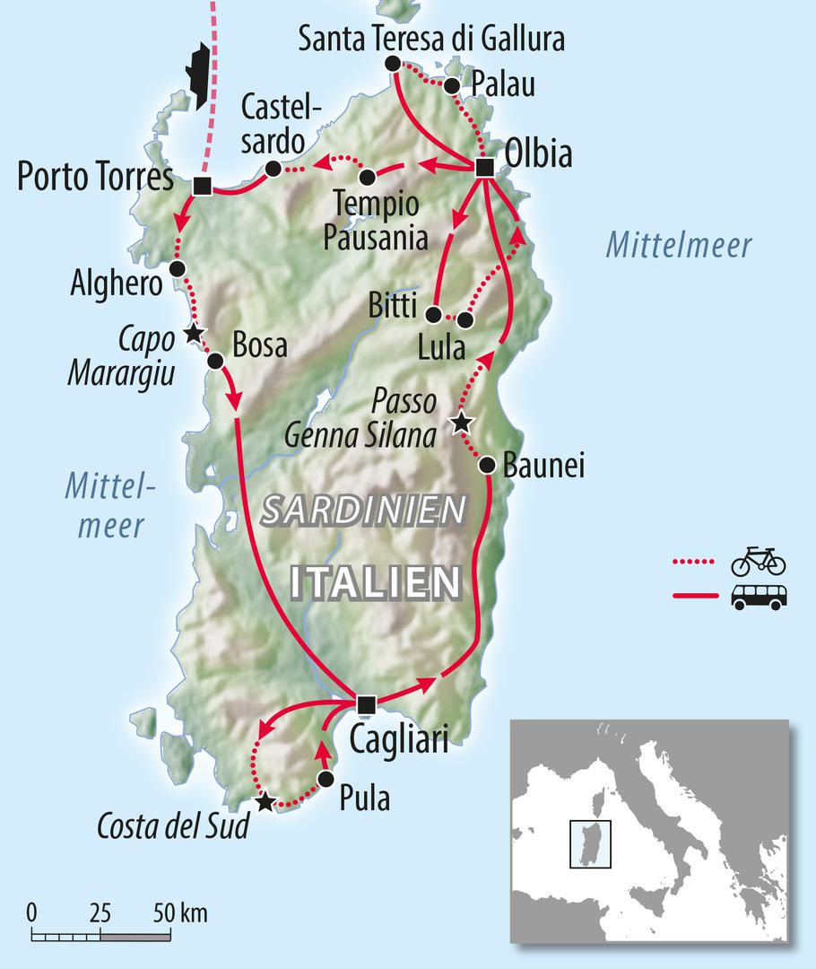 Sardinien – ein kleiner Traum im Mittelmeer! Typisch Italienisch und doch „insulanisch“. Wie auf Elba, Sizilien – so auch auf Sardinien sind die Menschen stolz auf ihre Insel. Und das zu Recht. Phantastische Landschaften, Berge, Meer und grandiose Aussichten. Dazu ein tolles Straßennetz mit gutem Belag und oft wenig Verkehr! Ein Geheimtipp eben – und Sie sind mit dabei! Auf unserer Entdeckungstour durch Sardinien lernen Sie große Teile der Insel kennen. Wir begrenzen uns nicht nur auf einen kleinen Teil der Insel. Somit haben Sie jeden Tag ein neues Ziel – jeden Tag eine neue Tour und Fahrspaß pur! Sardinien erleben mit dem Fahrrad und dem Bus, der für Sie Strecken überbrückt. Dazu zwei gute Standort-Hotels, dadurch müssen wir auf Sardinien nur einmal umziehen.