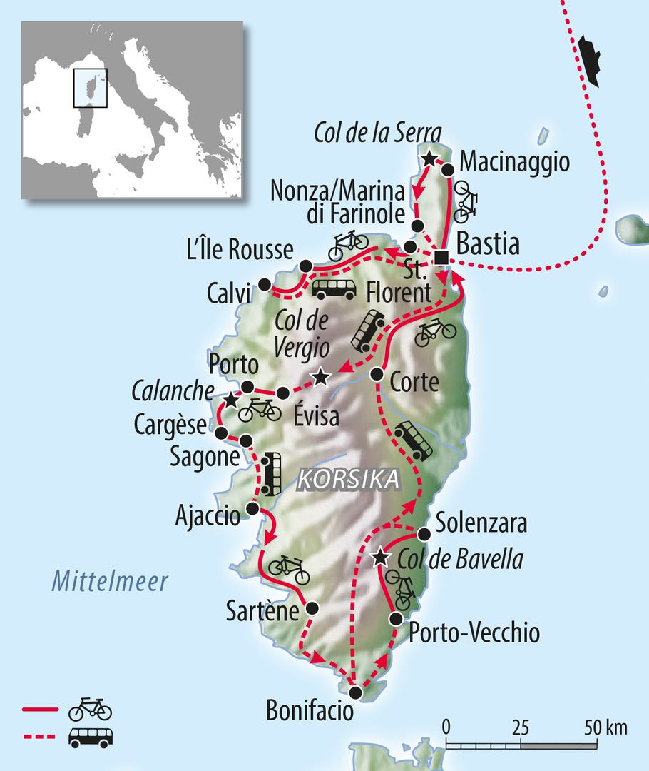 Die viertgrößte Mittelmeerinsel Korsika wird wegen des markanten Höhenprofils auch „Gebirge im Meer“ genannt. Somit sind Radtouren auf der französischen Insel recht anspruchsvoll. Die wunderschöne und abwechslungsreiche Landschaft, die einsamen Meeresbuchten mit dem kristallklaren Wasser, die unberührte Natur gaben der Insel auch den zweiten Beinamen „l’île de beauté / Insel der Schönheit“. Wir freuen uns während unseres Radurlaubs auf die kleinen verkehrsarmen Straßen und die wunderbare Ausblicke. Mit unseren Radtouren lernen Sie die korsische Kultur und nahezu die gesamte Insel kennen. Mit der Nachtfähre erreichen wir am zweiten Tag Korsika und erkunden von Bastia aus den nördlichen „Wurmfortsatz“ der französischen Insel. Tags darauf radeln wir entlang der Nordküste von Bastia nach Calvi, einer mittelalterlichen Festungsstadt. Nach zwei Übernachtungen in nördlichen Korsika bereisen wir jetzt die Mitte und den Süden der Insel. Vom Col de Vergio radeln wir durch die sehr wellige korsische Hügellandschaft bis Ajaccio. Natürlich steht auch die südliche Spitze von Korsika auf unserem Radreiseprogramm. Die malerische Hafenstadt Bonifacio verbindet mit dem Fährbetrieb die französische Insel mit Sardinien. Die Meerenge zwischen Korsika und Sardinien – Straße von Bonifacio – ist nur 12 km breit und wegen des starken Windes (Mistral) und Strömungsverhältnissen bei Seglern gefürchtet. Im letzten Teil unserer Korsika-Radreise widmen wir uns den Osten der schönen Insel. Weinberge, Korkeichenwälder und romantische Hafenstädte machen diese Reise zu einem unvergesslichen Erlebnis. Mit der Nachtfähre geht es dann nach sieben Tagen zurück auf das französische Festland und wieder nach Deutschland.