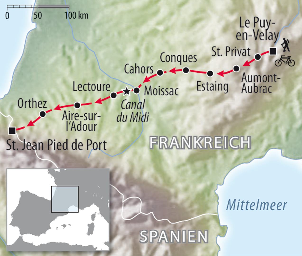 Wer nach Santiago de Compostela möchte, muss immer durch Frankreich. Somit laufen alle Jakobswege durch Frankreich, dort „Chemin-St.-Jacques“ genannt. Pilgern Sie mit Ihrem E-Bike oder Fahrrad auf der Via Podiensis, einem der vier historischen Jakobswege in Frankreich. Wir starten wie alle Pilger auf diesem Weg in Le Puy-en-Velay; vielleicht zünden Sie in der Kathedrale Notre-Dame-de-France eine Kerze für eine schöne Reise an. Mit dem Rad oder Ihrem Pedelec bewegen Sie sich durch das hügelige Zentralfrankreich, somit müssen Sie schon Kondition oder als E-Biker vielleicht einen zweiten Akku dabei haben. Tagesetappen um die 70 km sind zu schaffen, die Höhenmeter bis zu 1.400 m und das gute Essen sorgen dafür, dass Sie abends gut schlafen. Aber keine Sorge: Wem die Kräfte oder der Strom versagen, steigt in unseren Radbus, der Sie tagsüber begleitet und natürlich Ihr Gepäck transportiert. Unterwegs sammeln Sie viele schöne Stempel für Ihren Pilgerausweis. Im Zentralmassiv wird uns bewusst, das Frankreich bei weniger Bevölkerung fast doppelt so groß ist wie Deutschland. Die Einsamkeit mit wunderschöner Landschaft genießen wir vom Fahrradsattel. Nahezu unberührte Eichen- und Buchenwälder, schroffe Felsen und herrliche Aussichten machen diese Radreise unvergesslich. Ziel Ihres 10-tägigen Radurlaubs ist dann das malerische Saint-Jean-Pied-de-Port am Fuße der Pyrenäen, eine wichtige Stadt an der Via Podiensis und zugleich der letzte Ort in Frankreich. Als Camino Francés geht es dann mit unserer Anschlussradreise „Spanischer Jakobsweg“ über den Ibañeta-Pass durch die Pyrenäen nach Pamplona. Vielleicht bekommen Sie ja auch Lust, mit uns auf dem Rad oder Pedelec bis nach nach Santiago de Compostela zu radeln.