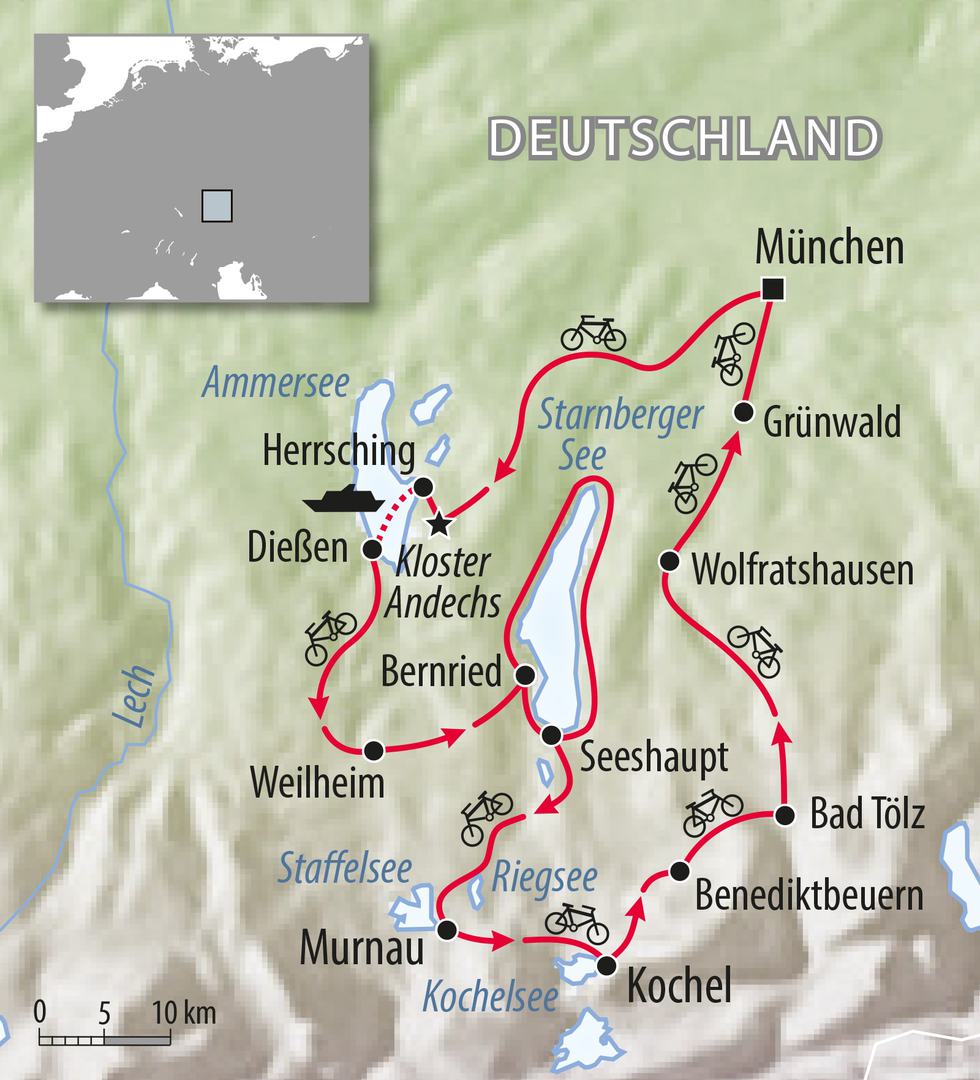 Oft wird in den Medien über die Schickeria am Starnberger See berichtet, über einen der schönsten Biergärten Bayerns im Kloster Andechs, über den Wegbereiter der modernen Kunst – den Blauen Reiter, über den Fernseh-Hit „Der Bulle von Tölz“. Geschichten und Geschichte darüber werden Sie erleben, während Ihrer Radtour von einem wunderschönen See zum nächsten. Bestimmt haben auch Sie danach Ihre eigene Anekdote über diese wunderschöne Gegend zu erzählen…