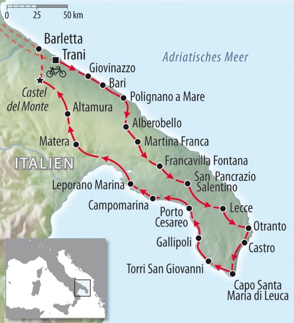 Apulien, das ist Süditalien erleben. Bei etwa 300 Sonnentagen im Jahr ist Apulien von der Sonne verwöhnt. Die Region ist für Rennradfahrer, die der kälteren Jahreszeit entfliehen wollen, wie geschaffen. Malerische Dörfer, einsame Felsenbuchten, verschlafene Fischerorte – der italienische Stiefelabsatz, bietet Urlaubern und Radfahrern landschaftliche und architektonische Höhepunkte: Sanft gewelltes Hügelland, Olivenhaine, kleine Fischerorte, Strände mit glasklarem Wasser und vor allem den ewigen Frühling! Dazu prunkvolle Barockstädte, romanische Kathedralen, landestypische, spitzkegelige Rundbauten (italienisch: Trulli), die heute häufig auch als Ferienhaus gebucht werden können. Und eine Vielzahl von Kastellen, die unter der Regie des Stauferkaisers Friedrich II. entstanden. Schon im März haben wir tagsüber schon mal mehr als 20 Grad, also ideale Temperaturen für eine schöne Rennradtour und im Oktober ist meist noch Badewetter. Auf unserer Rennradreise auf dem Stiefelabsatz lernen Sie Apulien mit allen seinen Sehenswürdigkeiten kennen. Insgesamt radeln Sie auf unserer Reise etwa 950 Kilometer und 7.200 Höhenmeter. Sie radeln ohne Gruppenzwang, die Rennradtour ist ohne Rennradreiseleitung.