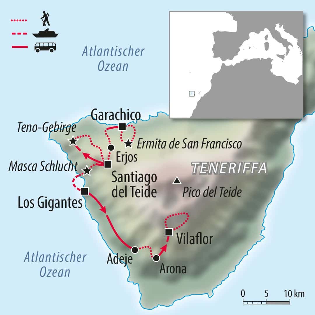 Insel ist nicht gleich Insel. So haben alle Inseln der Kanaren ihren ureigenen Charakter, den es bei der Inselwanderung auf Teneriffa zu entdecken gibt! Die größte Insel der Kanaren ist ein sehr beliebtes Ziel für Wanderurlauber – und das fast das ganze Jahr über! Von Februar bis Dezember ermöglicht das milde Klima im Atlantik Wanderabenteuer der Extraklasse. Die guten Wetterbedingungen sind es auch, die der Insel ihr typisches Erscheinungsbild verleihen. Sie wandern vom grünen Nordwesten Teneriffas bis ins südliche Inselinnere, queren schroffe Küsten und passieren urige Bergdörfer. Das sind acht Tage pure Wanderlust mitten im Atlantik!